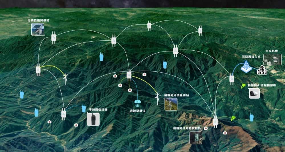 在没有蜂窝网覆盖的自然保护区、国境线或其它偏远地区,不依赖于市电供电和固定宽带网络接入,以低成本部署低功耗的自组网基站(无线通极限系列),为无线通跨越系列(连接IPC)等多种自组网终端设备等提供互联网接入